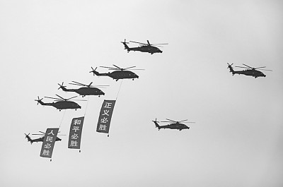 在纪念中国人民抗日战争暨世界反法西斯战争胜利80周年大会上,空中护旗梯队接受检阅。新华社发